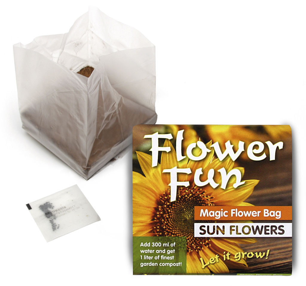 Kweek uw eigen tuintje vol met zonnebloemen met deze bloemenzak Inhoud: – Plastic kweekzak 10 cm x 10 cm x 10 cm (LxBxH) – Cocostablet ca. 10 cm x 10 cm x 1 cm (LxBxH) – Zakje zaden