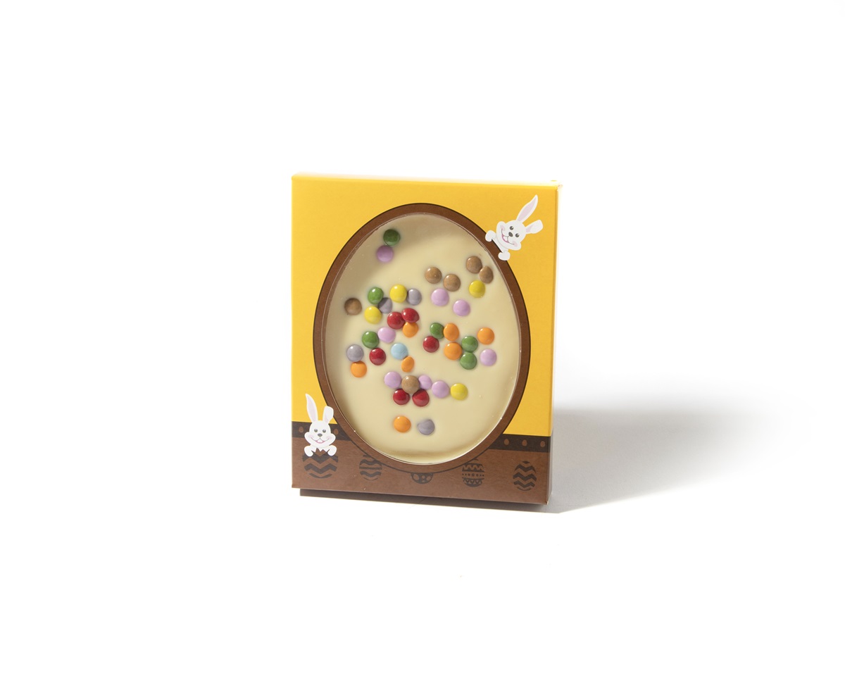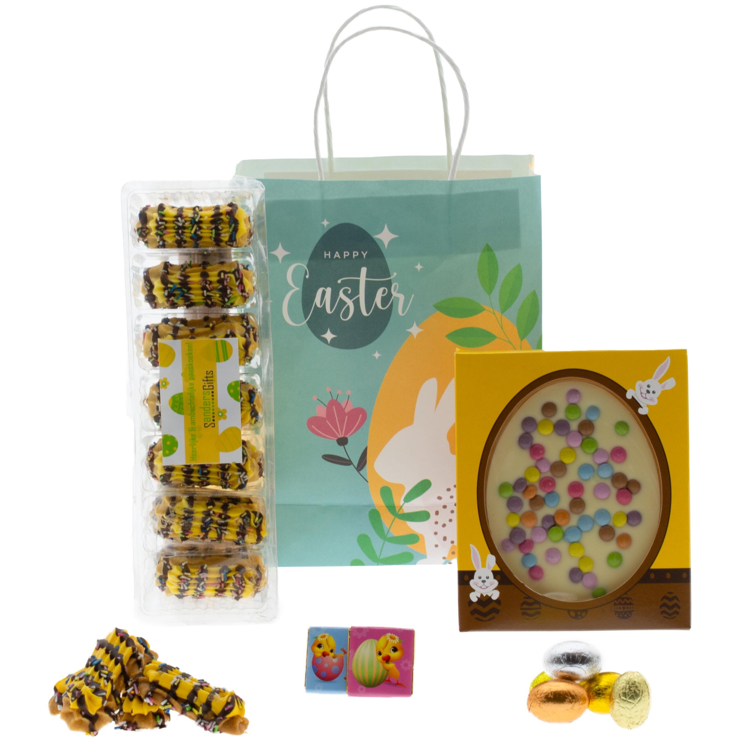 Een paaspakket om van te genieten met heerlijke chocolade. Verpakt in het tasje op de achtergrond