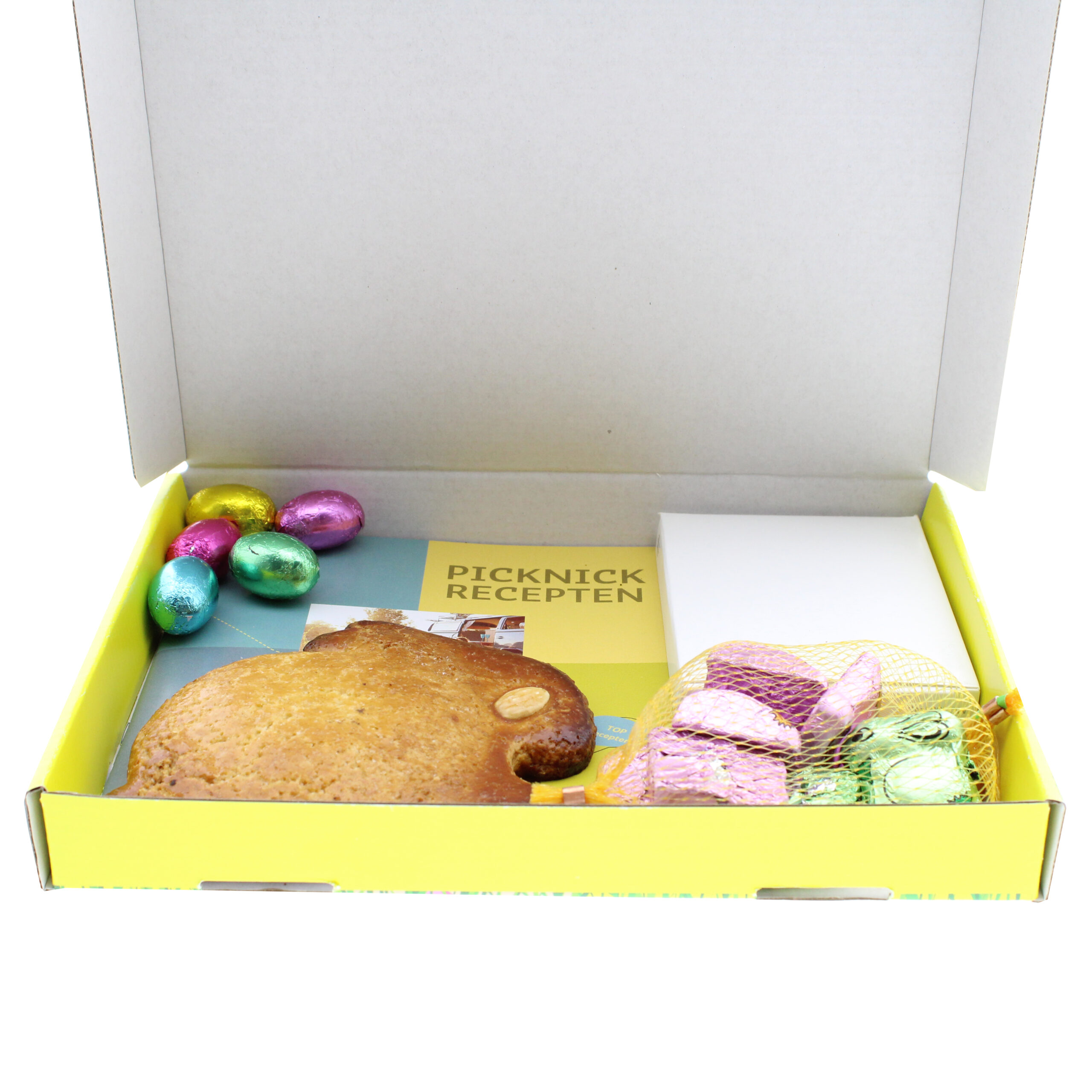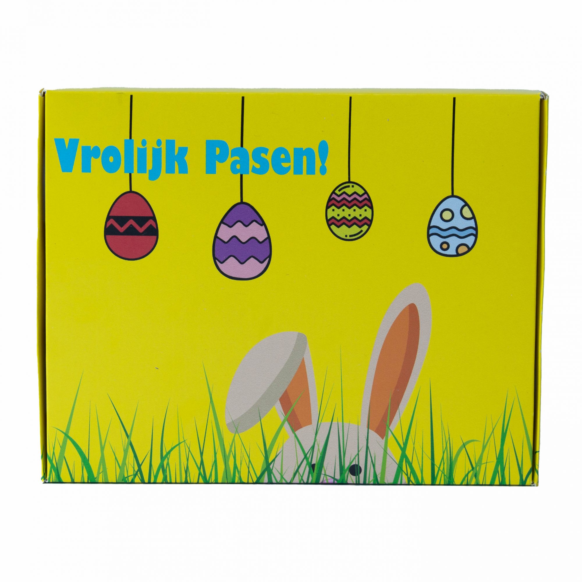 Een groot paaspakket in een klein brievenbusdoosje, bevat een decoratieset en lekkere snacks. Een gezellig paaspakket voor uw personeel.