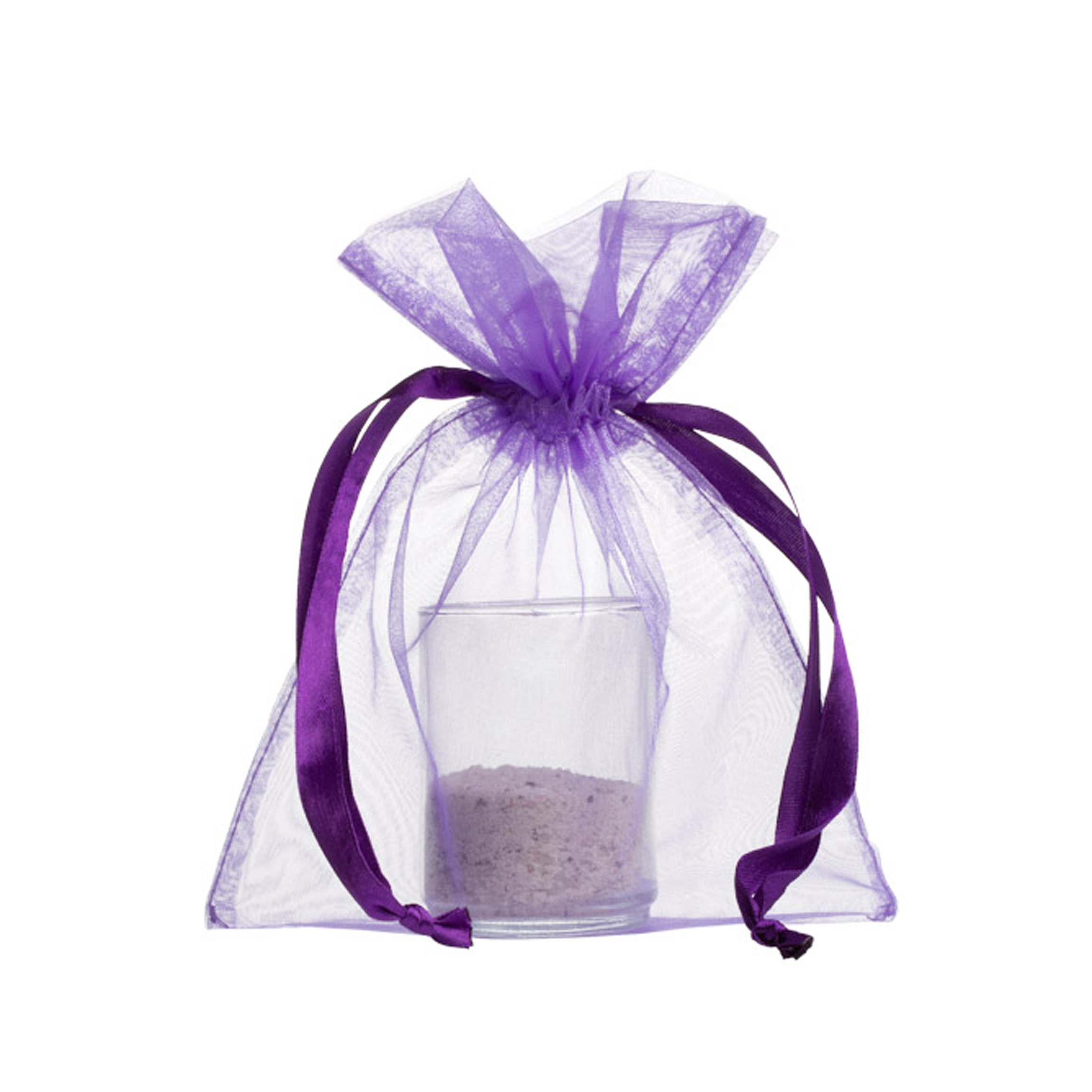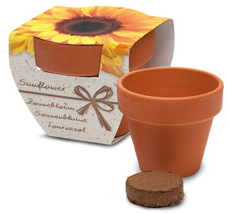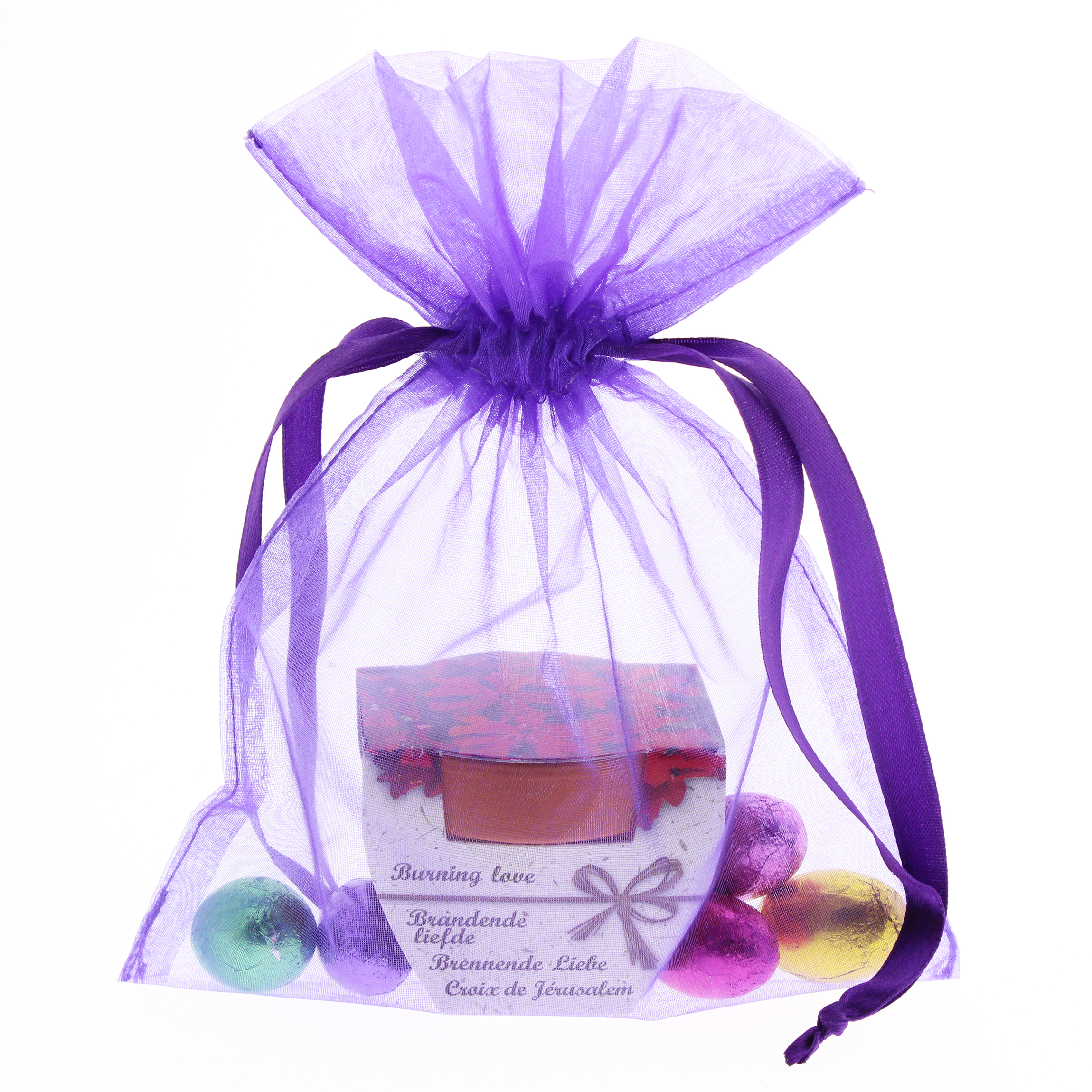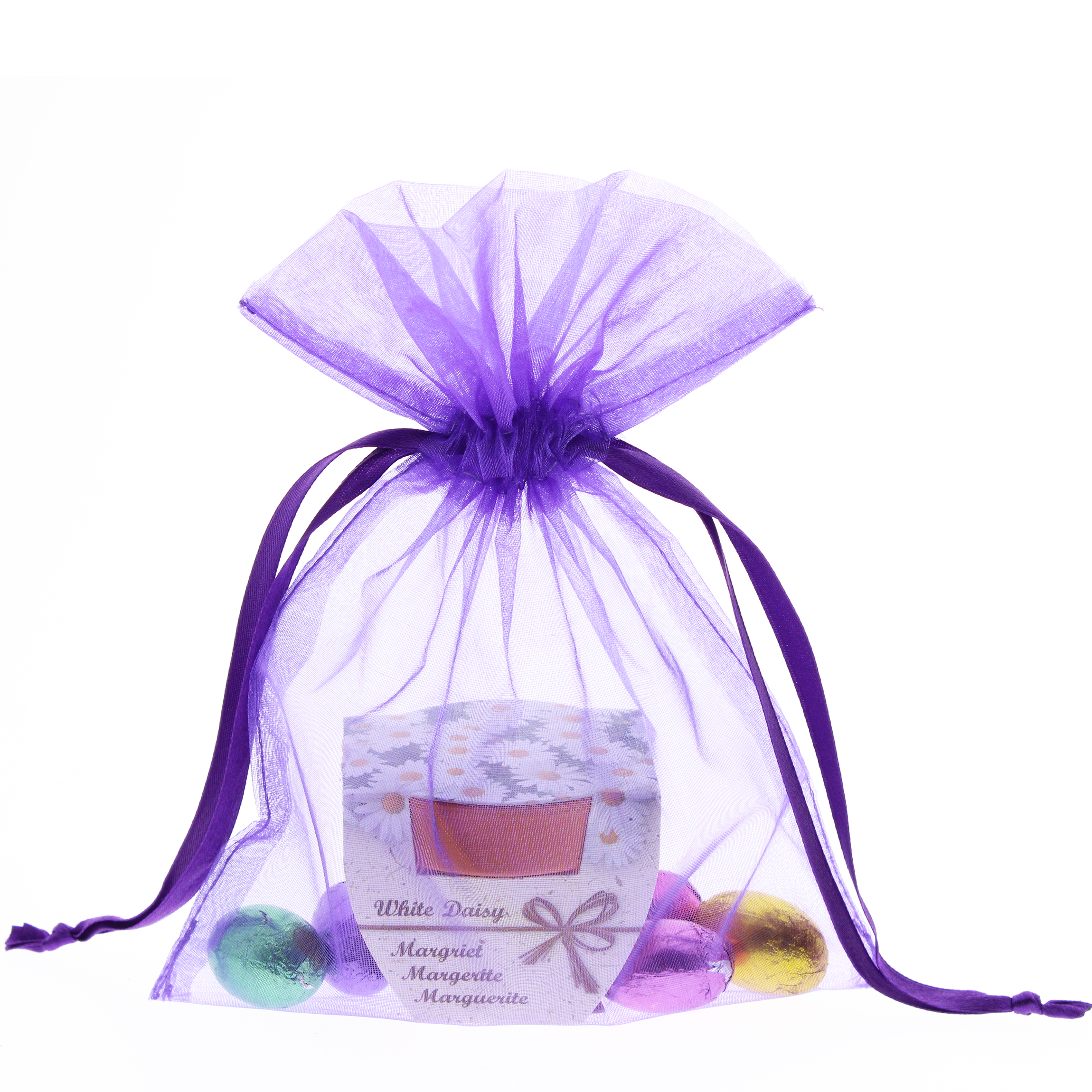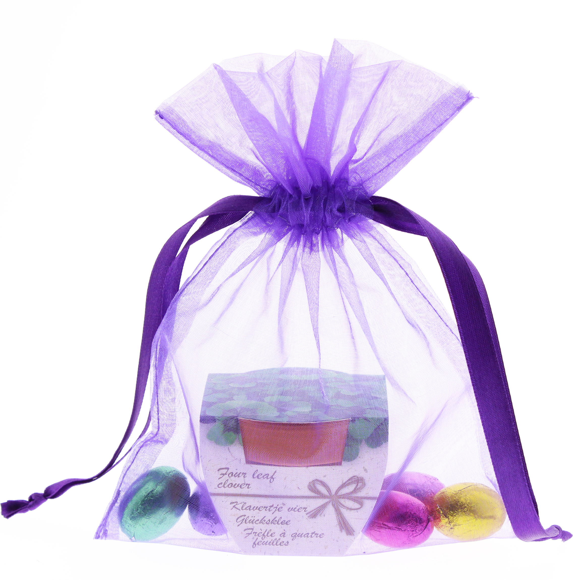Klein paasgeschenk met 5 praliné paaseitjes en terracotta potje met zaadjes in een vrolijk paars zakje Keuze uit de volgende zaadjes; Zonnebloem, Margrietjes, Brandende liefde, Klavertje vier en Vergeet mij nietjes.
