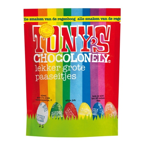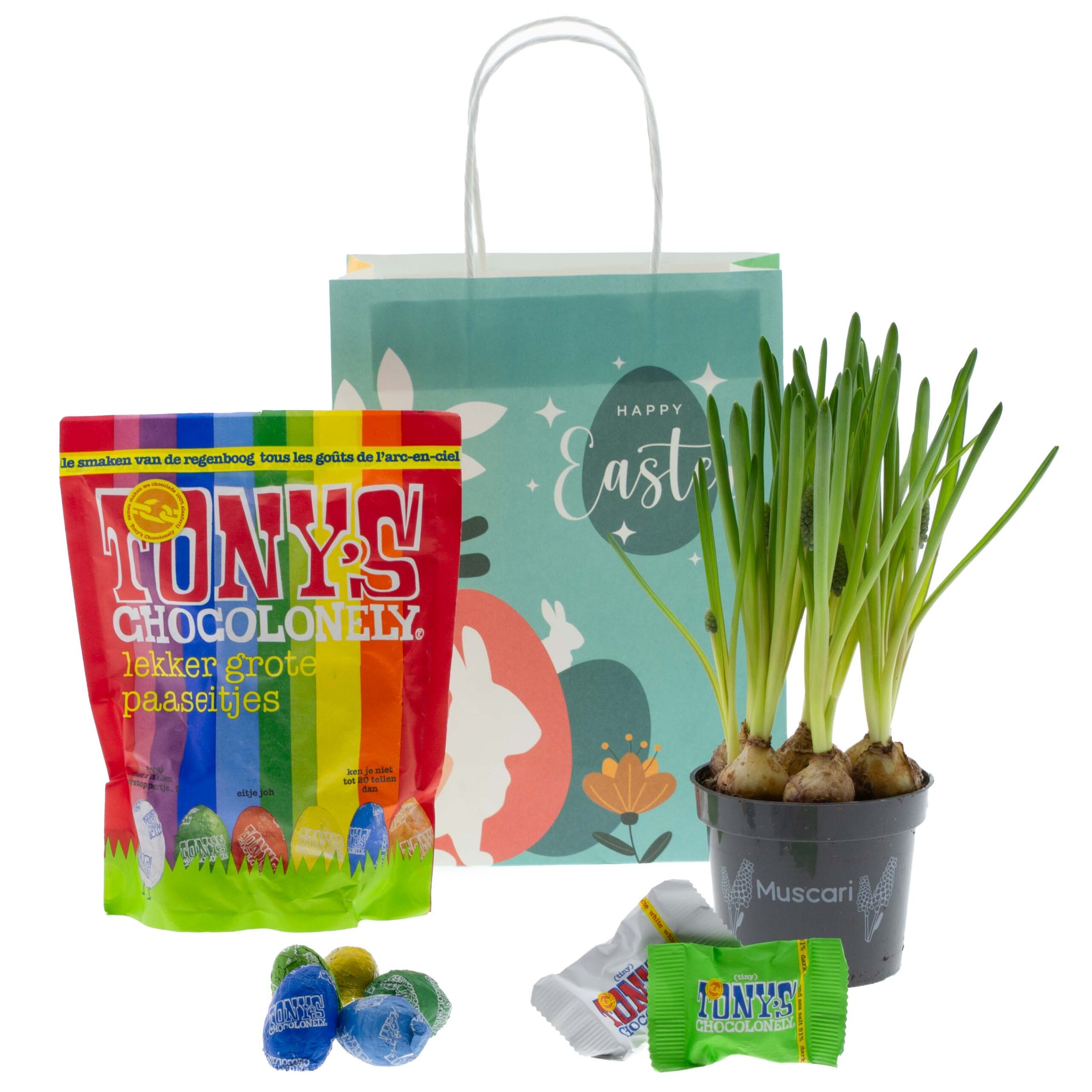 Een heerlijk Tony Chocolonely paaspakket met een leuk plantje. Verpakt in het tasje op de achtergrond.