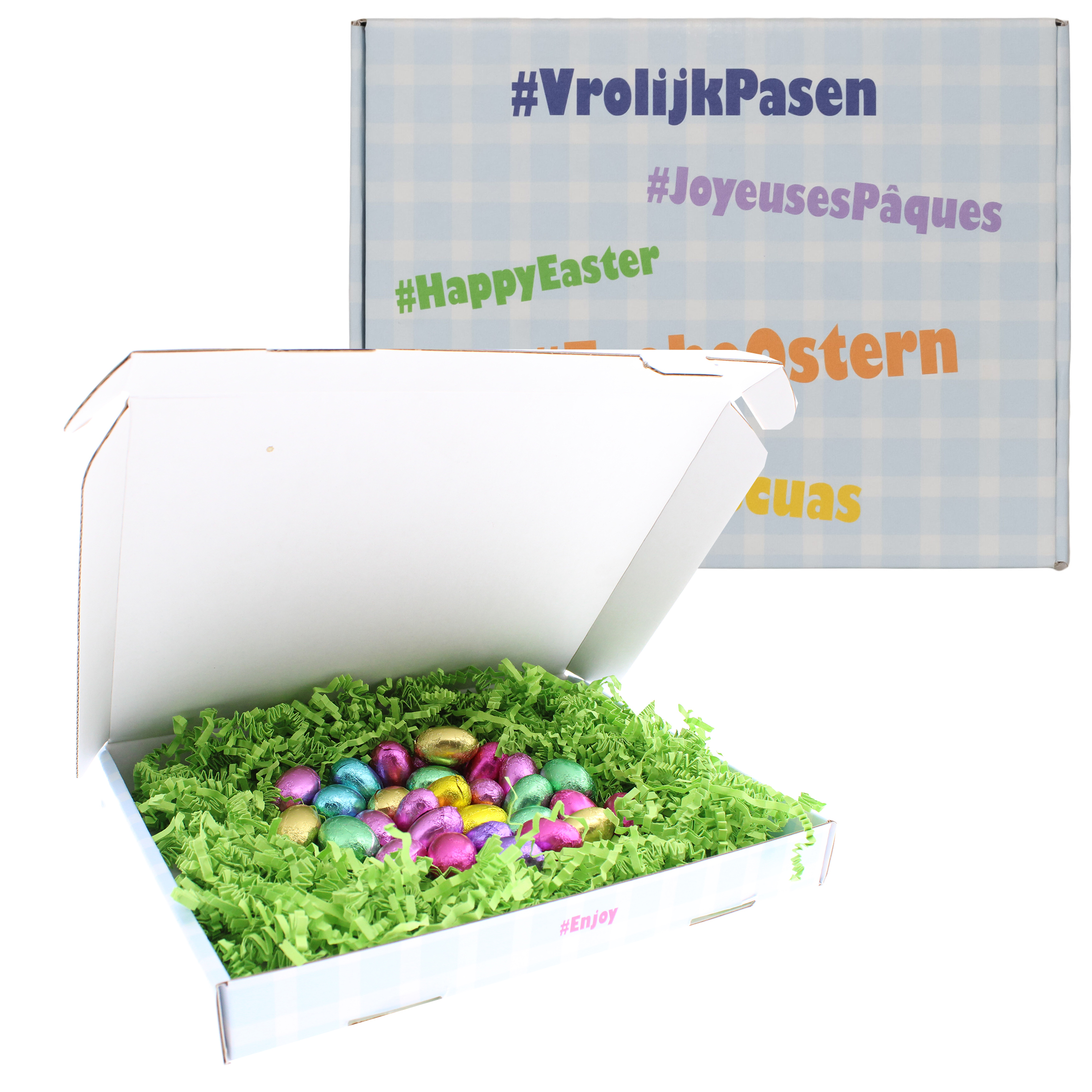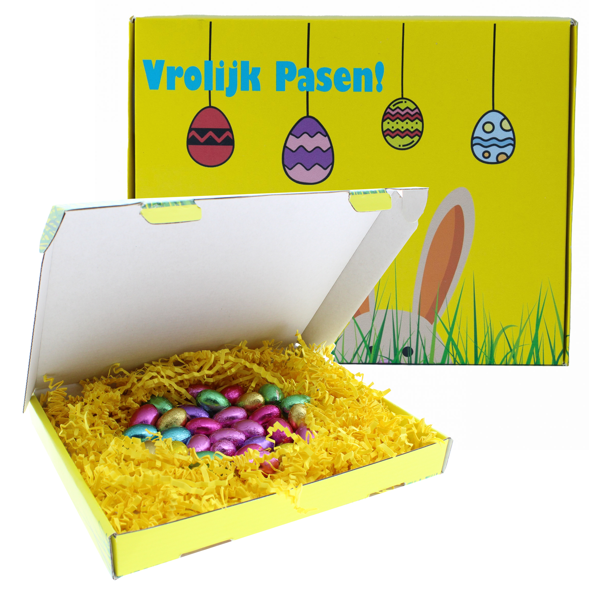 Brievenbusdoosje met 30 praliné paaseitjes in een bedje van sizzle, verschillende kleuren mogelijk.