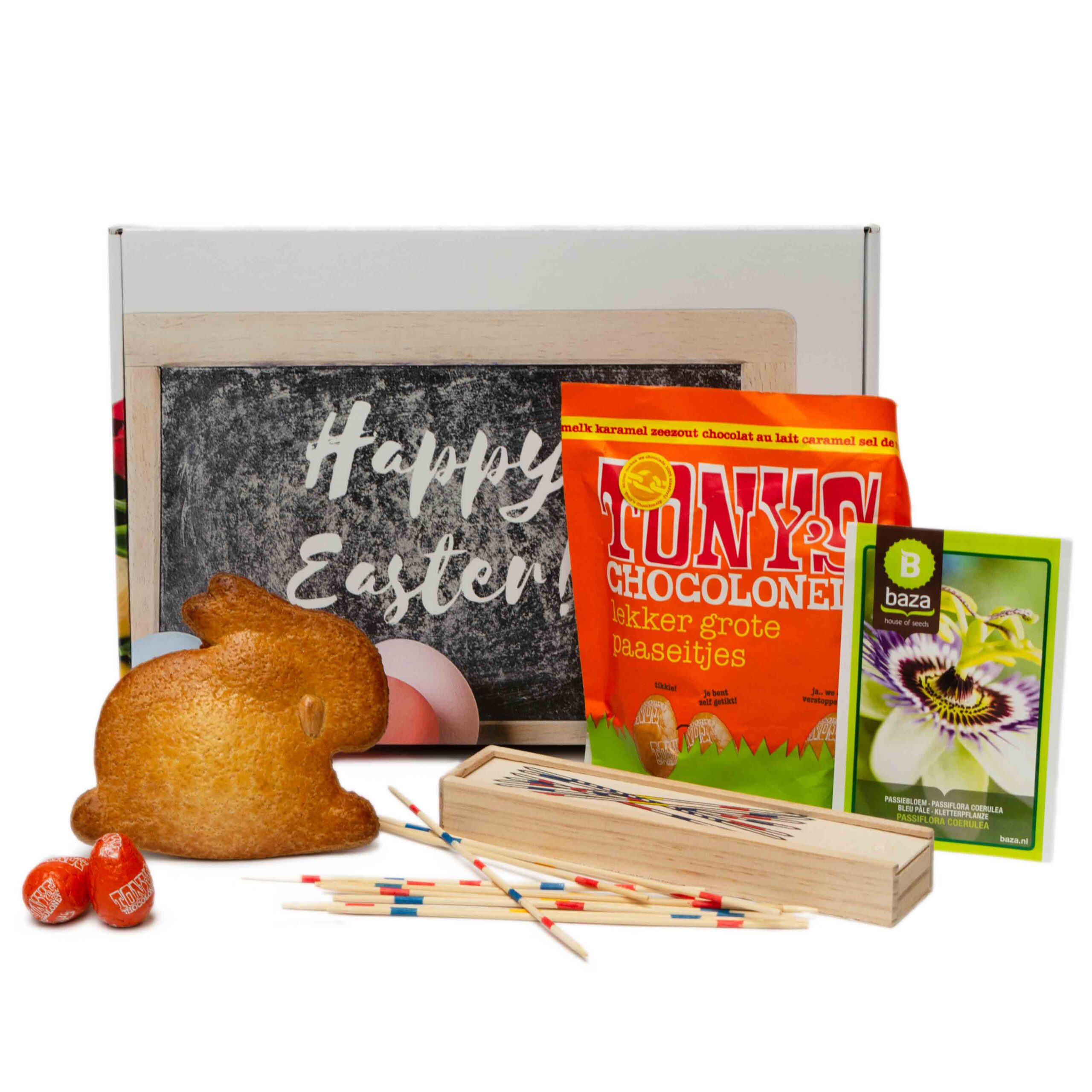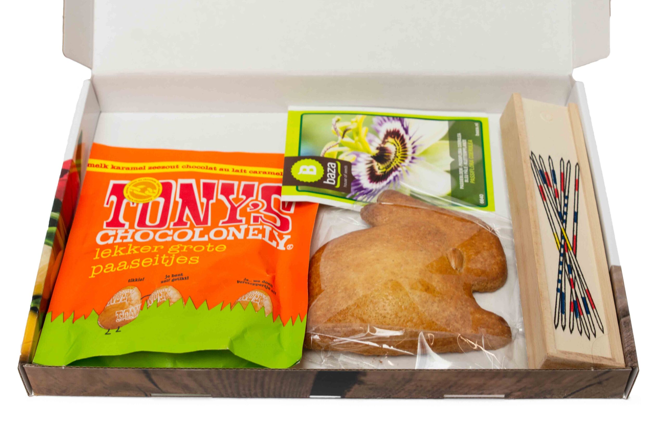 Een klein paaspakket met een leuke inhoud, bevat een spelletje, zaadjes en lekkere snacks. Gemakkelijk verpakt in het doosje op de achtergrond.