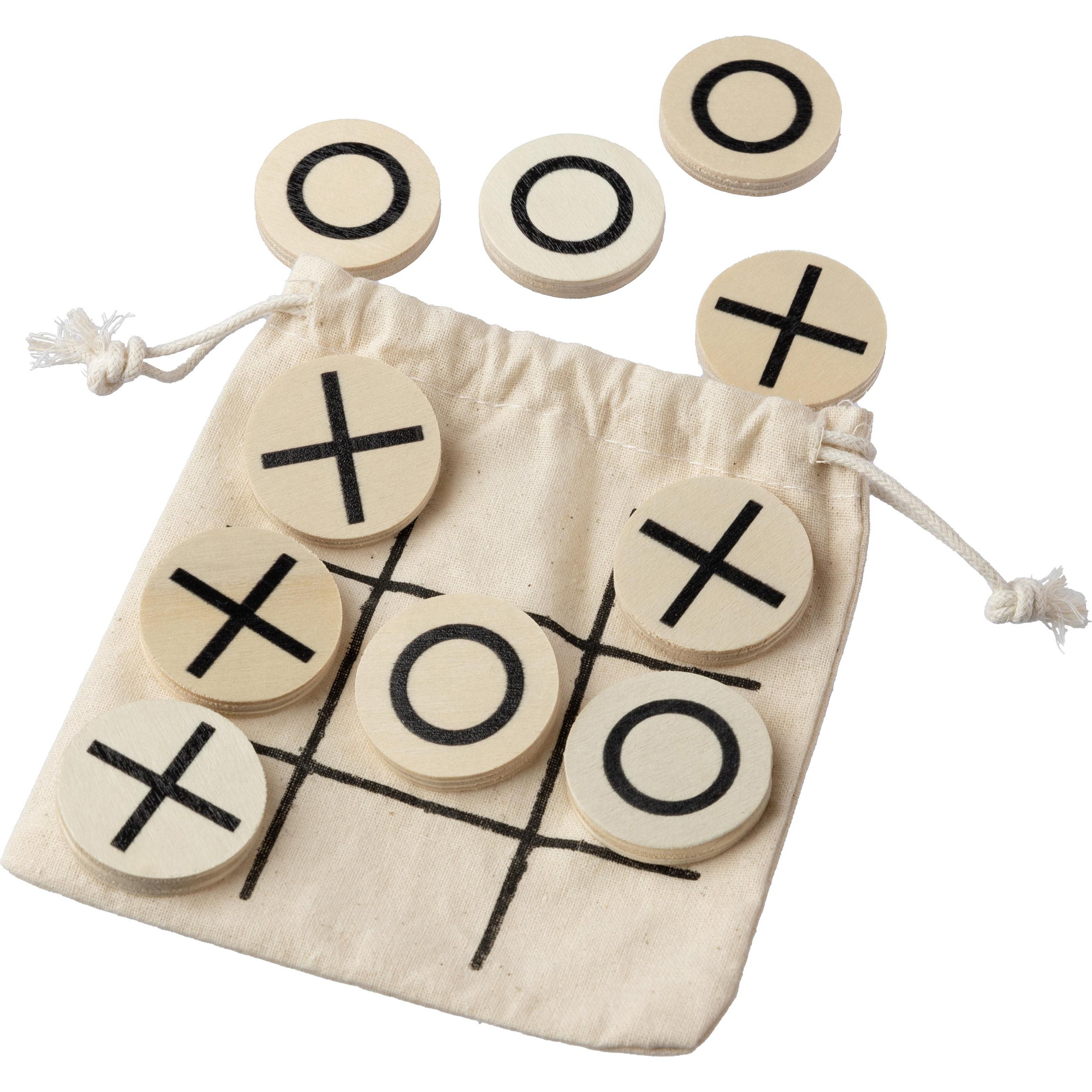 Natuurlijk houten tic-tac-toe spel, inclusief 10 kleine houten fiches verpakt in een katoenen zakje.